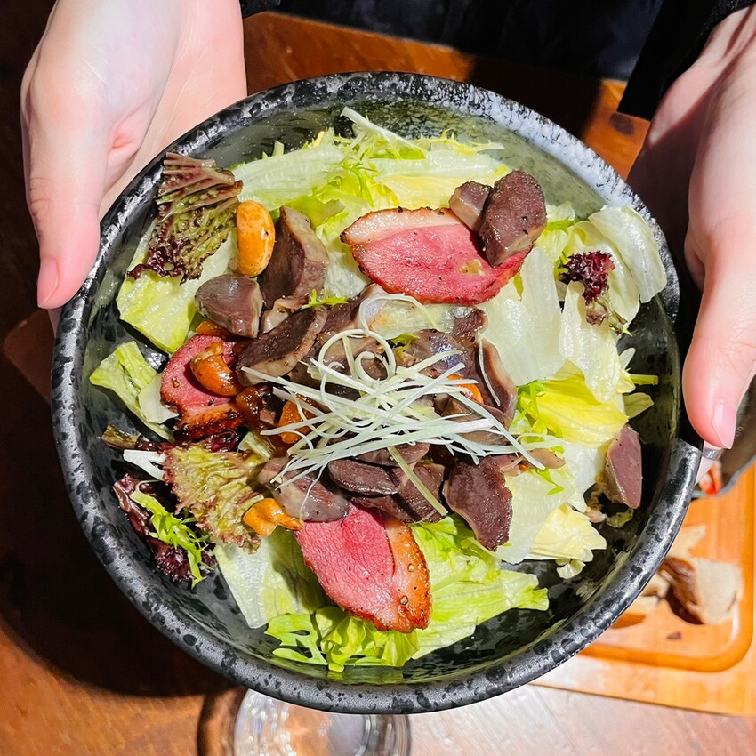 ▼肉量不手軟的這道沙拉餡料超豐富,除了鴨油拌炒的煙燻鴨胸、油封鴨胗及生菜,還有堅果及金桔點綴增加口感,