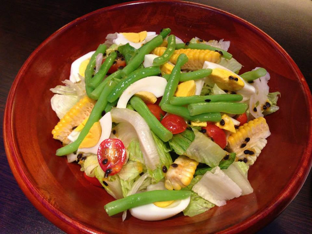 首先登場:百香果油醋鮮蔬沙拉、凱撒雞肉沙拉。百香果油醋,我推~