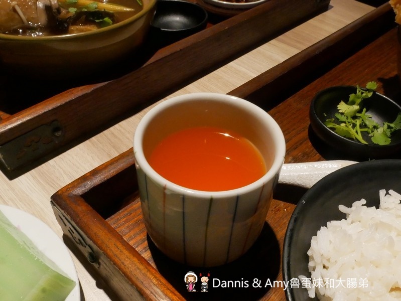 一旁有附上酸甜的綜合果汁,但這個我就沒那麼愛,其實放桶茶飲在店內讓客人自行取用我覺得也是不錯的選擇,也比較不浪費。
