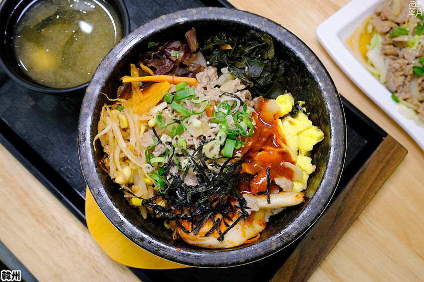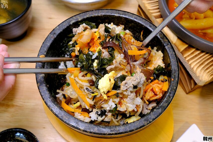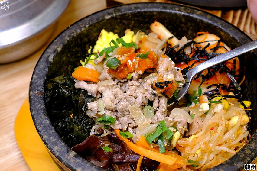石鍋拌飯也是店內人氣品項,拌飯上面會放紅蘿蔔、辣豆芽、泡菜、豬肉、炒蛋、海帶芽及黑木耳,最後再灑上蔥花及海苔絲。
