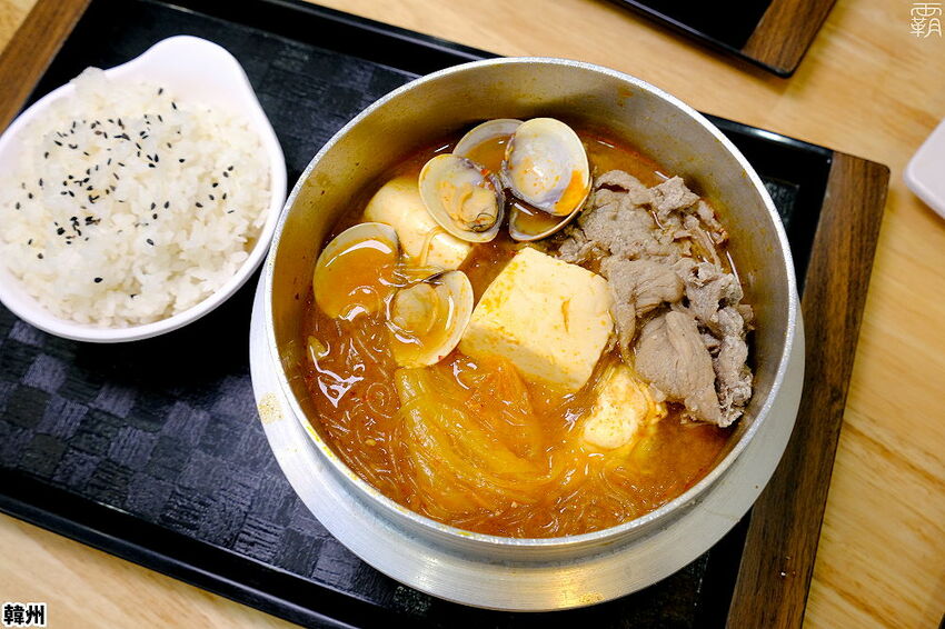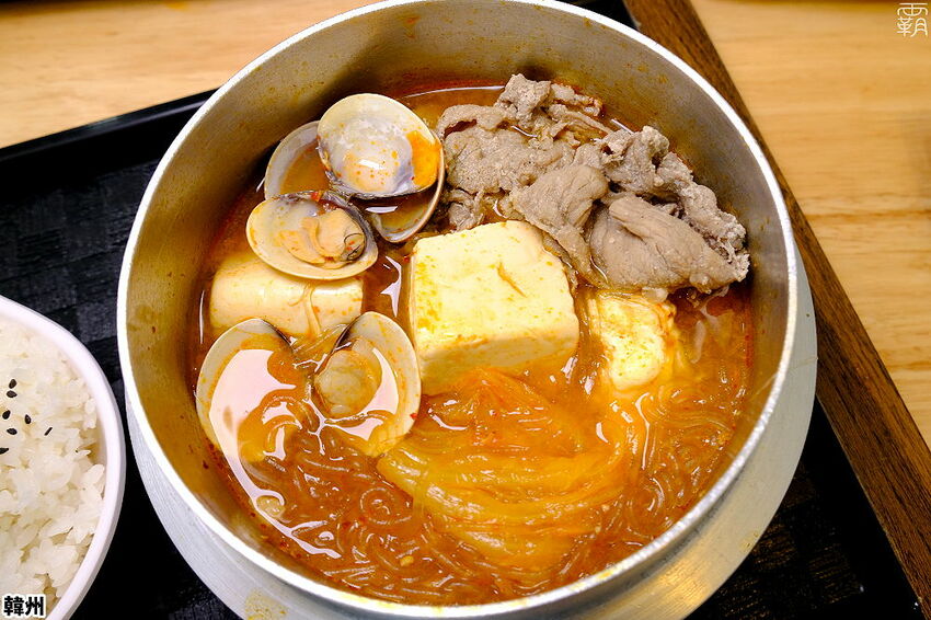 泡菜鍋裡面有加自家醃過的梅花豬肉片、泡菜、嫩豆腐、熟蛋、蛤蠣及冬粉,還有附上一碗白飯,可以選擇小辣或中辣的口味。