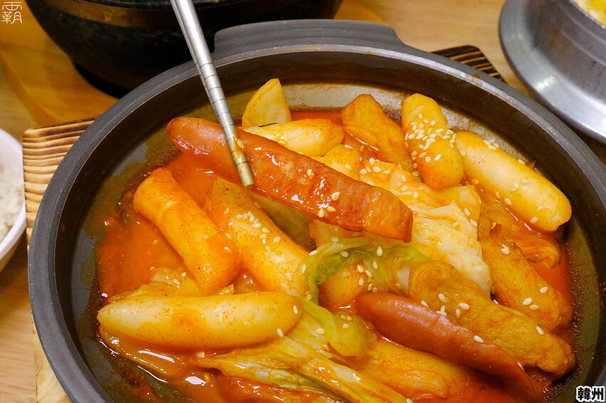不僅有軟Q的年糕,還有脆脆彈牙的德式香腸,帶點煙燻氣息可以中和辣味,再配上清脆的高麗菜及魚漿甜不辣,配飯配湯吃很恰當。