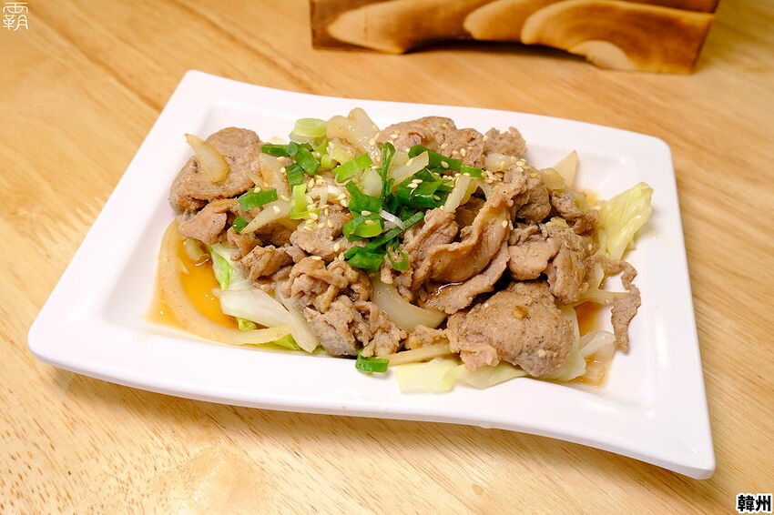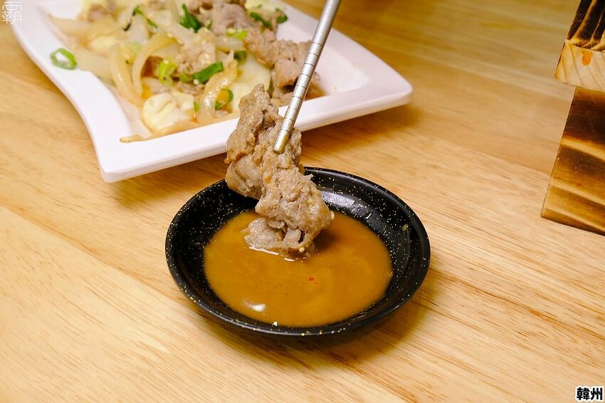 韓式烤肉挑選的肉片跟泡菜鍋內的豬梅花肉一樣,同樣會先醃漬過後再去跟洋蔥拌炒過。