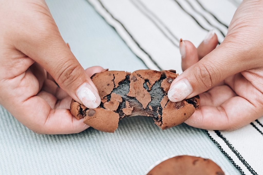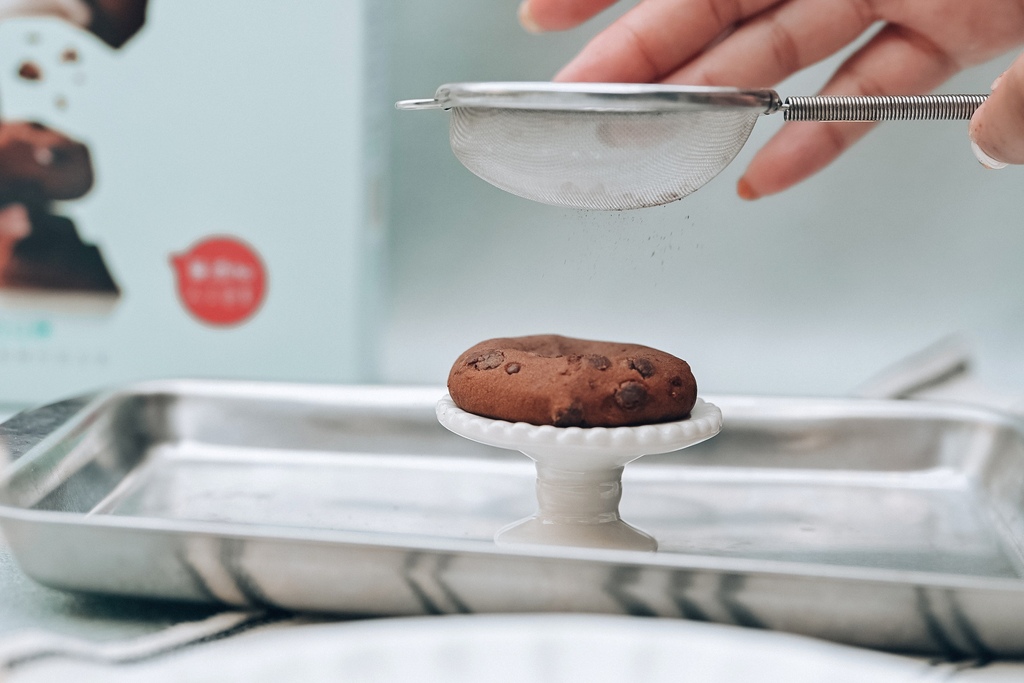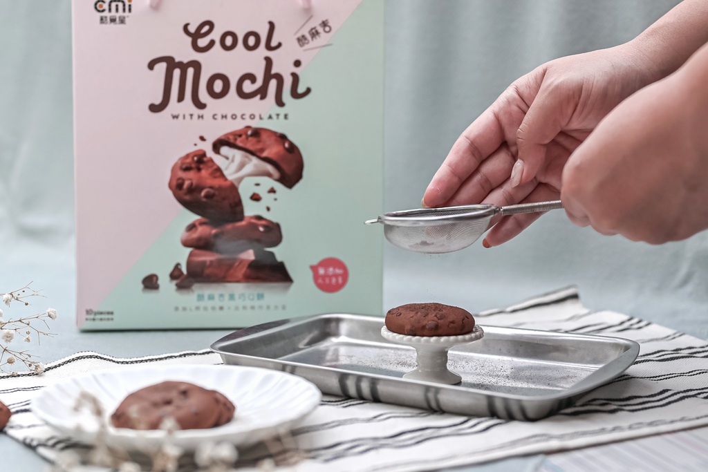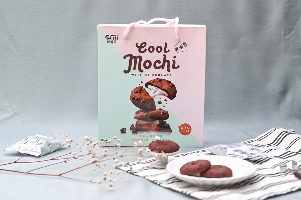 撕開包裝是一塊黑巧Q餅,選用來自比利時Puratos頂級巧克力包裹著糯米,巧克力餅上又撒上滿滿比利時巧克力豆,絲滑柔順,入口即化如奶油般化開巧克力濃郁甜香的滋味全化在你濃我濃之間。
