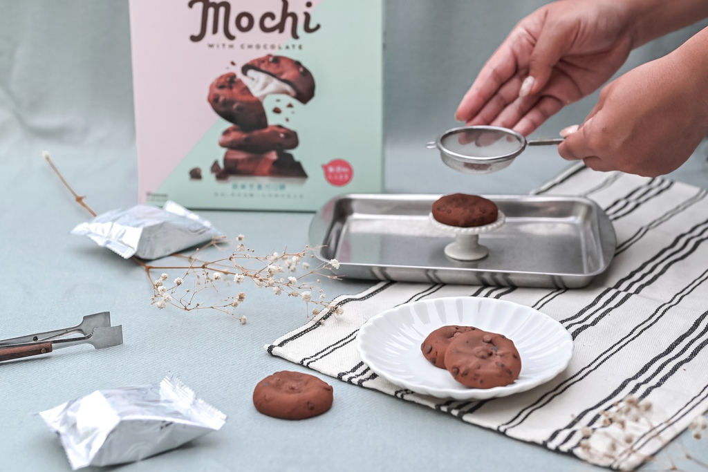 看起來會以為黑巧Q餅是脆硬的,但摸起來是軟軟糯糯的,一撕開來麻糬內餡隨著我的手拉開順勢延展,巧克力味道濃郁配上Q彈不黏牙麻糬,吃起來香甜有嚼勁,也不黏手。