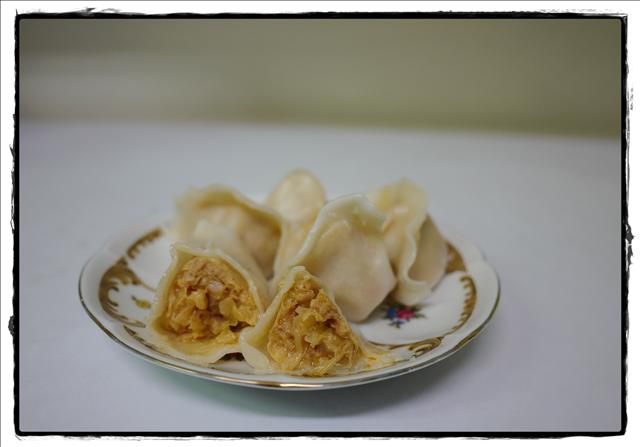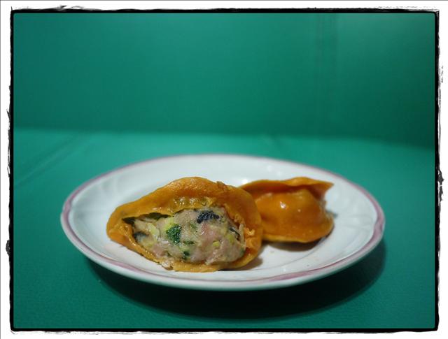 餃皮由南瓜汁做成 內餡是絞肉,私房咖哩調醬和洋蔥