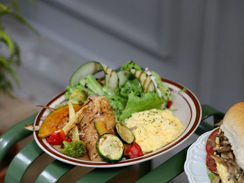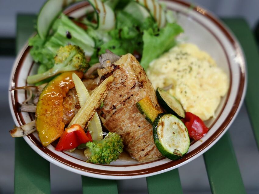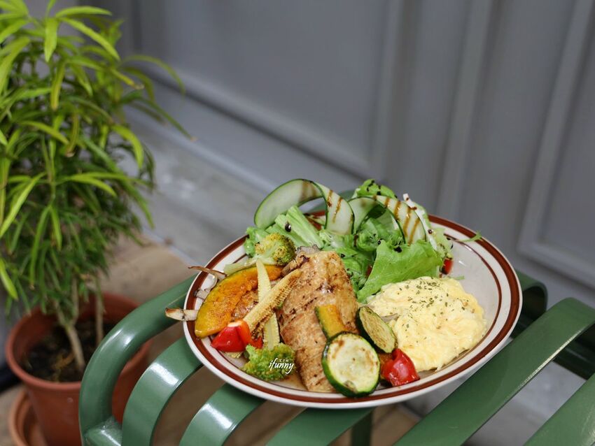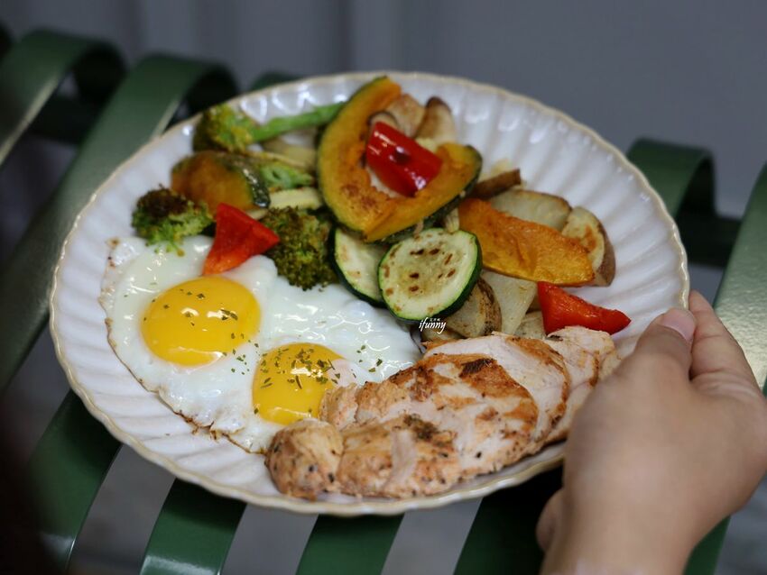 漂亮的太陽蛋,雞胸肉煎得赤香卻有著軟嫩口感。甜椒、青花椰、南瓜、櫛瓜、馬鈴薯等,吃到的都是最原始的味道,一早吃到這盤早餐,有飽足且營養均衡,很讚吧!