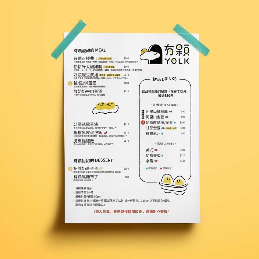 有顆YOLK的菜單(2021.02),販賣的品項沒有很複雜,但餐點都是現點現做,大家要有耐性等候。低消是一份餐點或一杯飲料。