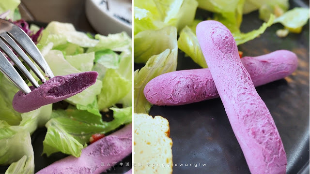 紫薯條是用紫心地瓜做成的條狀地瓜球,口感Q彈沒有油耗味,一問之下,原來是用氣炸鍋,非傳統油鍋油炸啊~頗有健康概念~