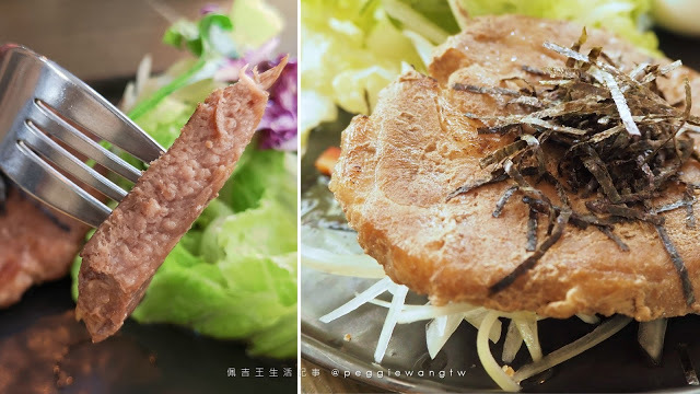 | 圖:厚實的醃漬豬里肌排,撒上海苔絲,底襯洋蔥絲,一同入口去膩提味~ |