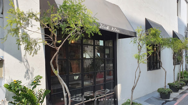 大樓三角窗一樓,被綠色植栽包圍、有著深灰色遮雨棚,外觀簡約清爽的白洋房,就是一緒二廚房啦~
