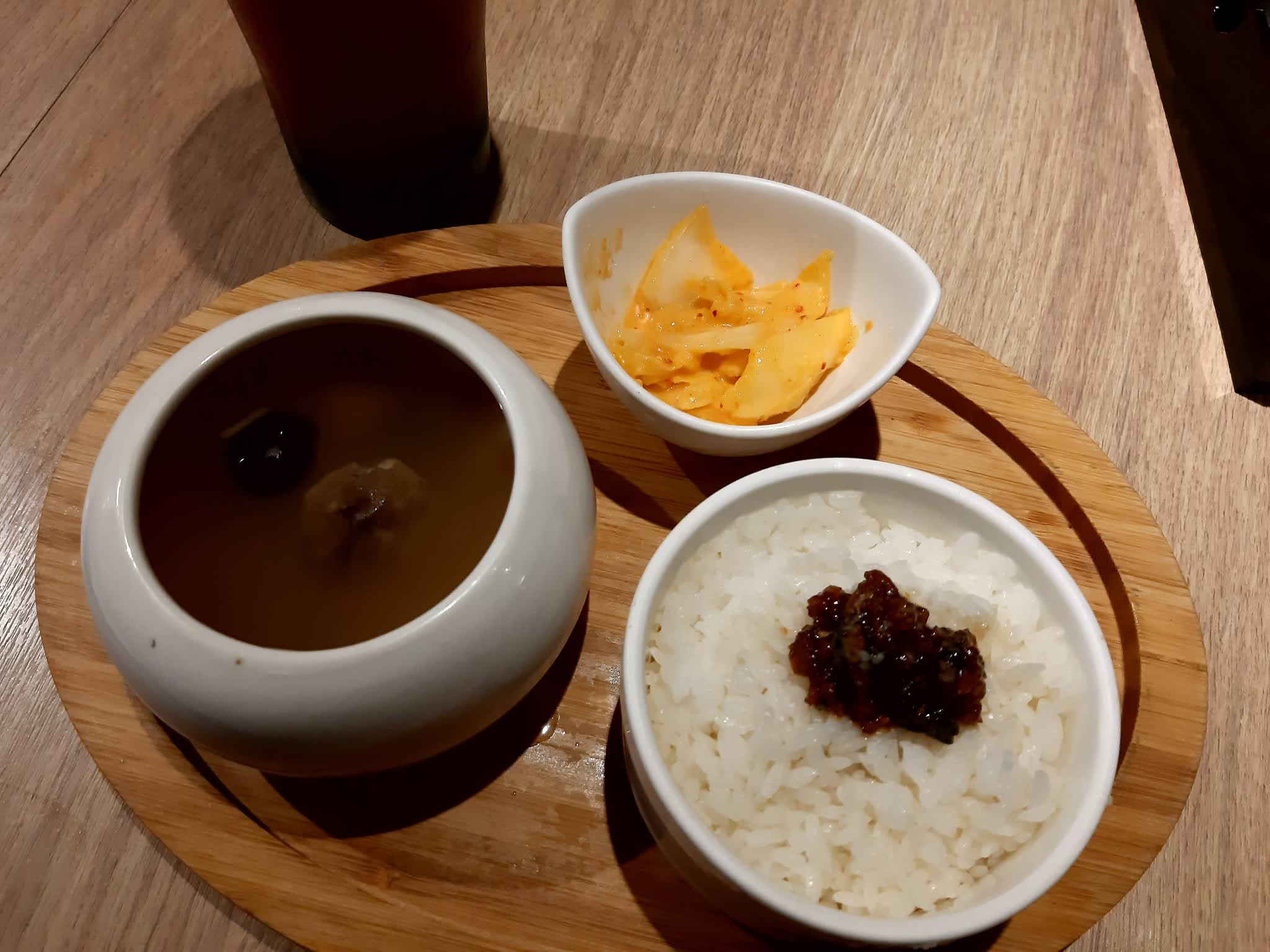 一開始先上副餐(湯品/飯食/開胃漬物)。飯食的香蔥豬油拌飯獲得一致好評,不知道是真餓了還是真的太好吃XD,雖然看起來飯上的醬料很少,但出乎意料的夠味,很下飯,主餐都還沒上,光單吃這碗飯就快扒完。我點的湯品是元氣鮮菇湯很濃郁好喝。