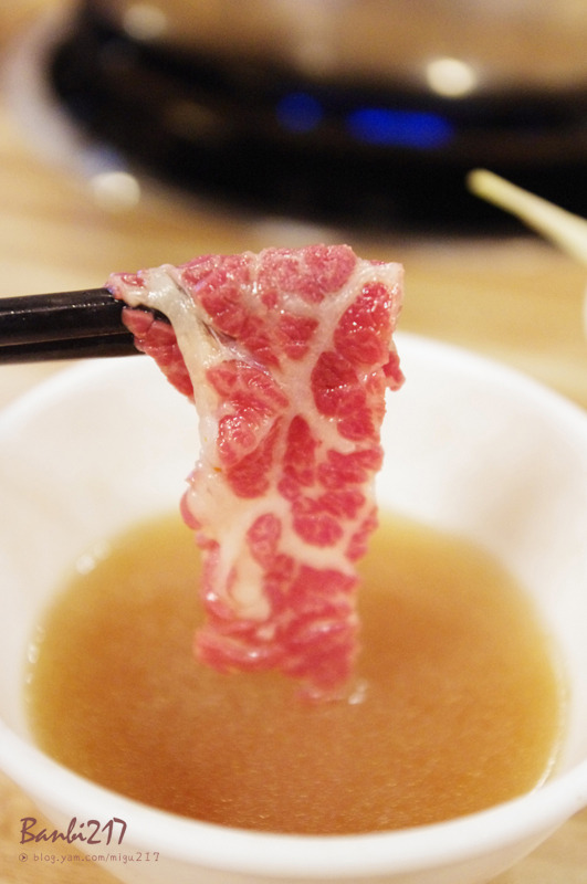 這樣好的牛肉,是可生吃的等級。所以只要將牛肉稍微涮一下即可入口中品嚐那肥美的油脂在舌尖融化的滋味哩!
