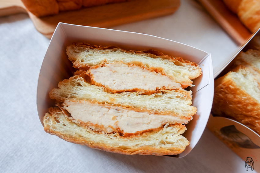 有沒有覺得芋頭可頌外觀完全跳脫一般可頌樣貌,做的很像三明治?酥香十足的可頌麵包體,藏著快炸出來大甲芋頭製成的芋泥內餡,芋泥內餡因為沒添加化學原料,口感滑順綿密,感覺很罪惡,但因為太好吃,一不小心就會全部吃完。