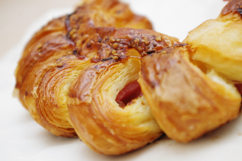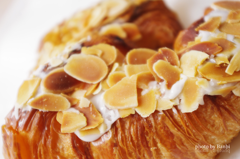 層層酥脆的牛角可頌麵包,上頭灑了杏仁片以及甜甜的白色醬(哈我不知道這是什麼醬)