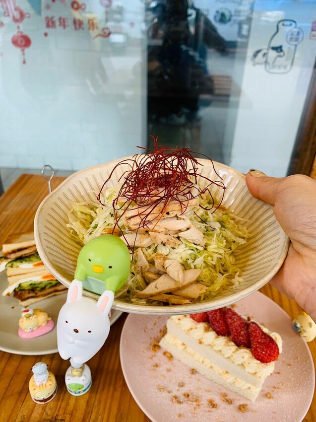 福來早餐的吐司口味真的都很特別~主廚鈑烤土司每個我都想吃看看,最後選了台式醃黃瓜半熟蛋炸豬排吐司和我最想吃的草莓卡士達吐司~媽媽點了舅媽嫩雞涼拌菜開胃~