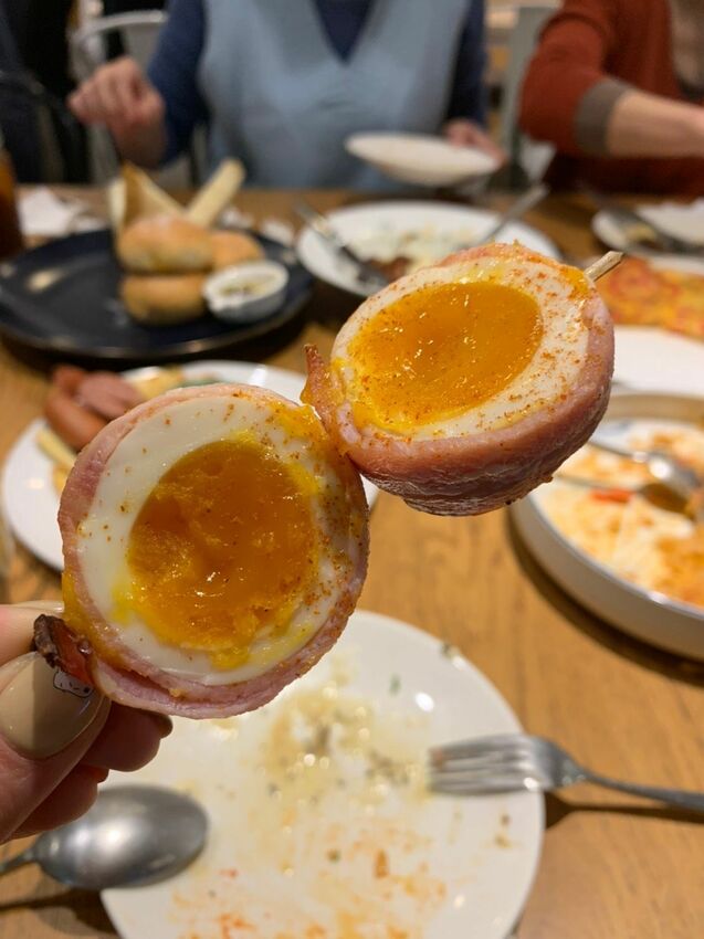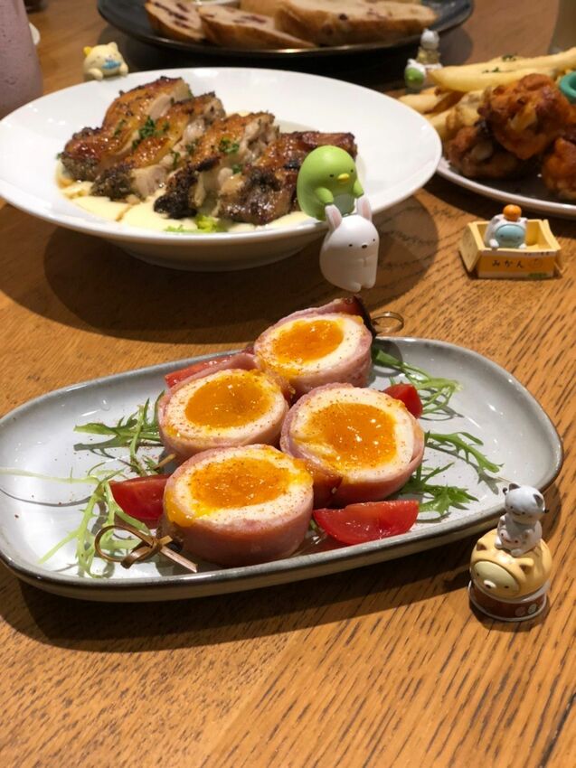 這是我看到菜單上的圖片就立刻點的一道菜,真的太吸睛了!小巧可愛的模樣,一層邪惡的培根包覆著我最愛的糖心蛋~~真的超愛!!!