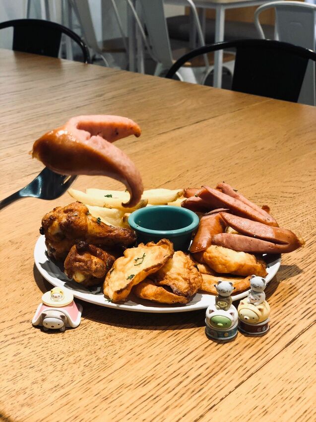 炸物拼盤有炸棒腿、薯條、德腸和手工天婦羅,第一次看到這種炸物拼盤有手工天婦羅!
