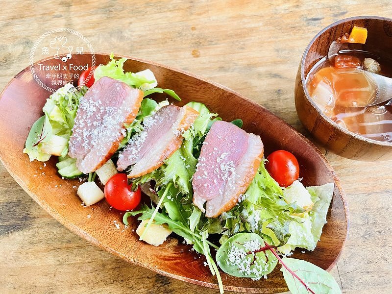 (沙拉三選一)經典凱薩鴨胸沙拉的鴨胸肉實在很軟嫩,搭配新鮮生菜葉,灑上起司粉就很美味了。