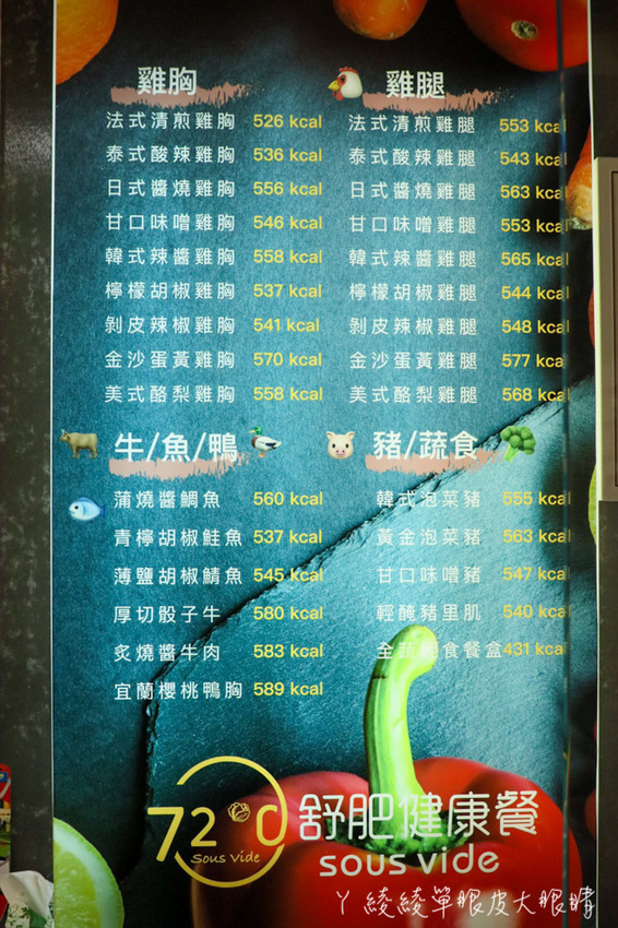 店門口的菜單有標示72度C舒肥健康餐各個餐盒品項的熱量,讓客人們參考,好貼心啊!