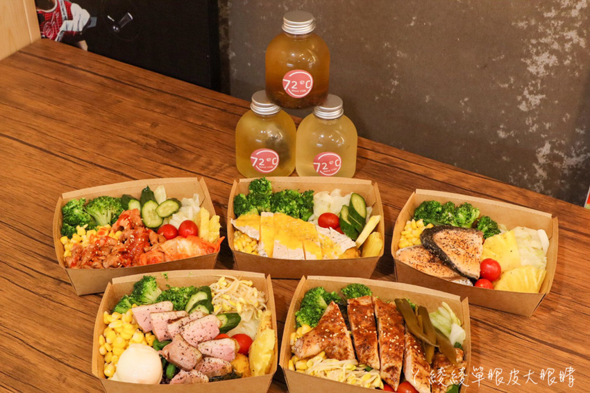 72度C舒肥健康餐的餐盒價格大約在百元出頭,菜單上有貼心註明食材產地,主要分為雞胸/雞腿/牛肉/豬肉/鴨肉/魚肉跟素食餐盒,以同等健康餐盒店來說算比較便宜,配菜種類豐富,主餐光是口味就將近有30種,就算常常吃也不容易吃膩,想要加量蔬菜、加肉、加溫泉蛋通通都可以!另有飲品可以加購選擇,外帶外送可打電話或加LINE預約。