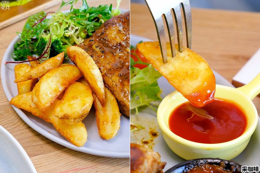 還有搭配生菜沙拉及脆薯,帶皮脆薯香酥軟綿,沾著番茄醬吃是小朋友的最愛。