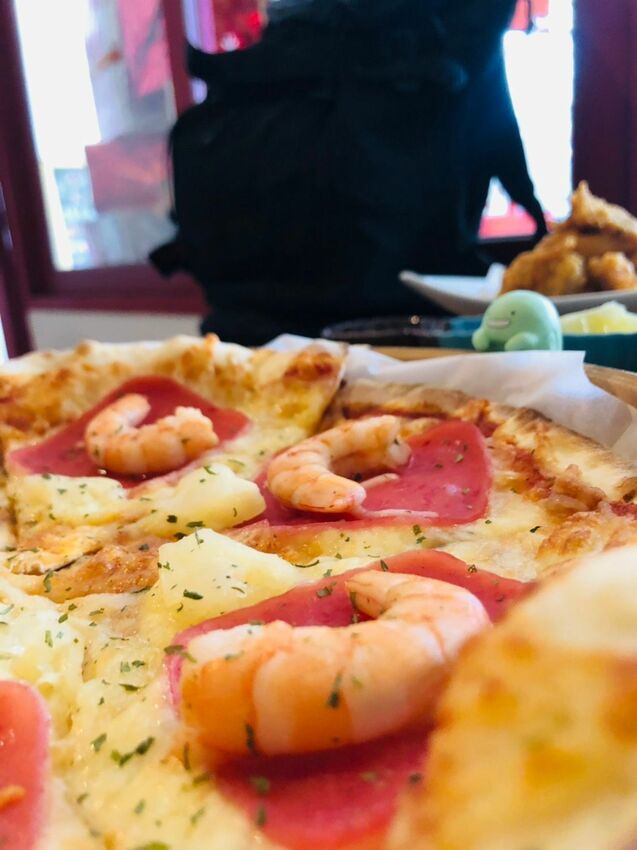 9吋大的手工披薩,份量真的很大!!慢慢來pizza屋的披薩是薄片的哟,有6片左右~餅皮香酥脆,上面料超多!!我好以歡這個蝦仁~很甜喔!!