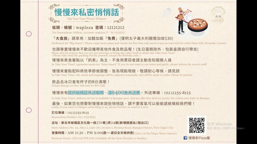 慢慢來pizza屋交通非常便利喔, 只要捷運搭到新埔站2號出口,再步行5分鐘就可以抵達了~位在巷弄裡店面卻不小,有四人座位也有雙人的喔~~店內座位滿多的,當天也有人訂位來聚餐,這裡的氣氛很適合約會、聚餐、聊天~