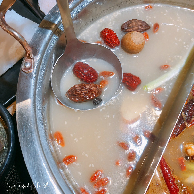 如果真的不喜歡香料味,蒙古紅也有提供甘蔗熬煮的湯頭,跟各種食材也是很搭的唷!