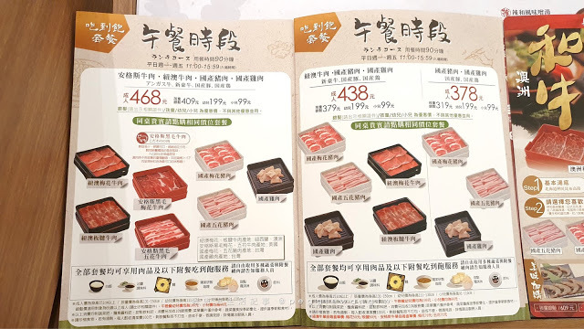 - 紐澳牛+國產豬雞肉:平日午餐$438、晚餐/假日$478