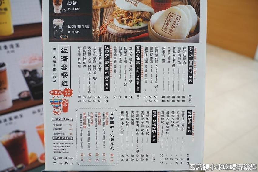 再來看看菜單吧,有著經濟套餐,一個刈包還可以選個飲品,有著優惠五元的折價優惠喔。