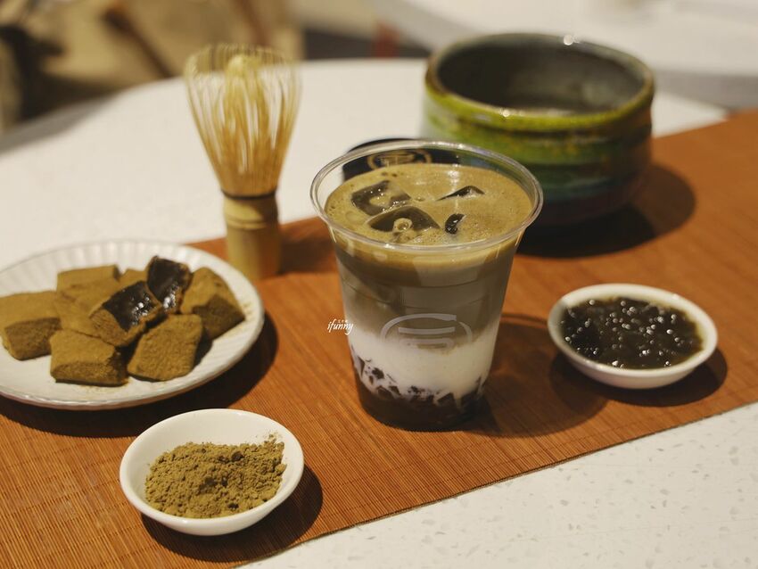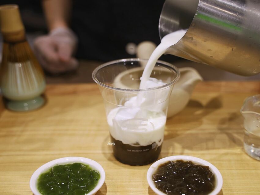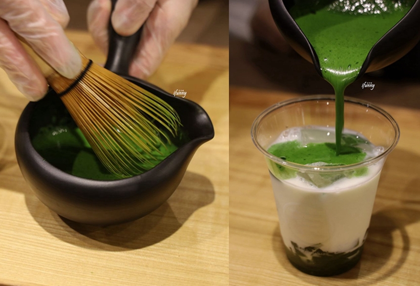 而抹茶蕨餅拿鐵的做法,也是當場現刷抹茶。