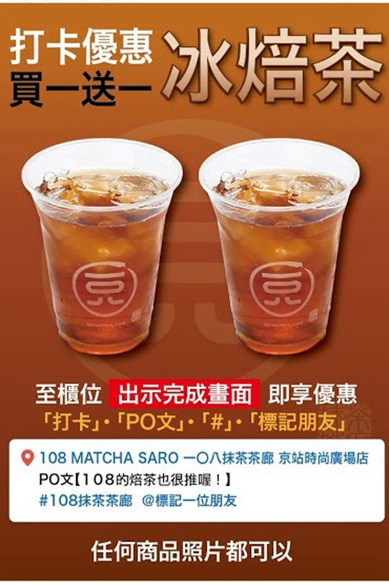 目前一〇八抹茶茶廊京站店買一送一的優惠,趕緊揪人一起來享好康。
