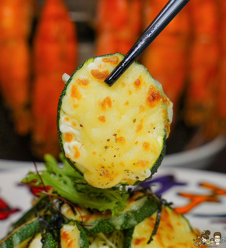 使用兩種起司、義式香料搭配,保有櫛瓜本身的清脆,咬下整個櫛瓜水嫩度湧上來