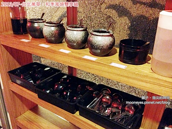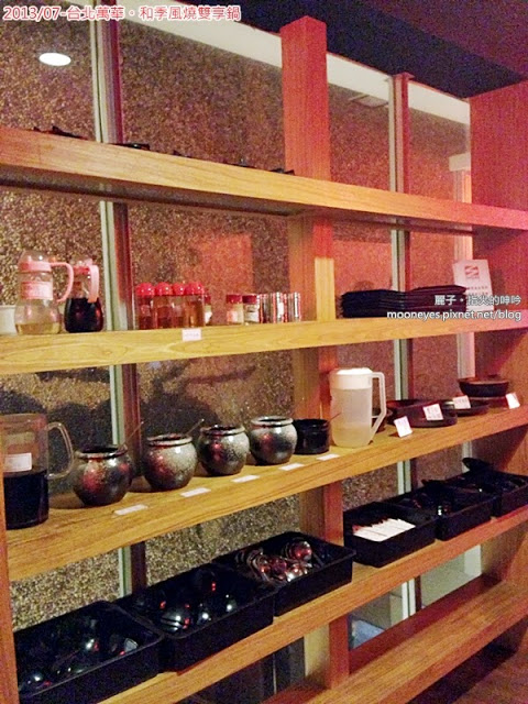 層架上放滿了餐具,跟調味料,請自助唷。