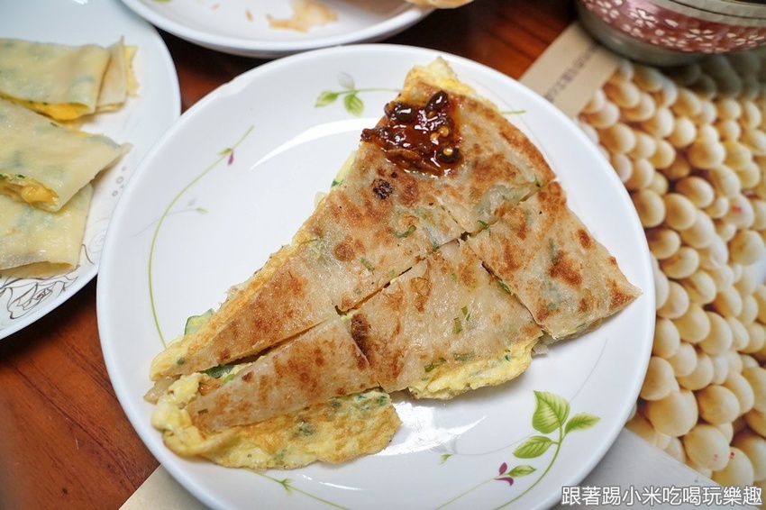 蔥油餅加蛋,他的蔥油餅也是屬於比較一個脆皮的口感,配著小辣椒,也有不同風味的享受啊。