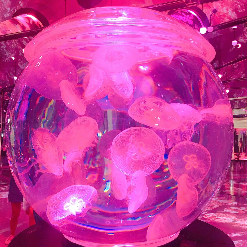 整片的水母區會不停變換顏色,紅色藍色紫色的燈光秀,讓水母看起來超夢幻的。