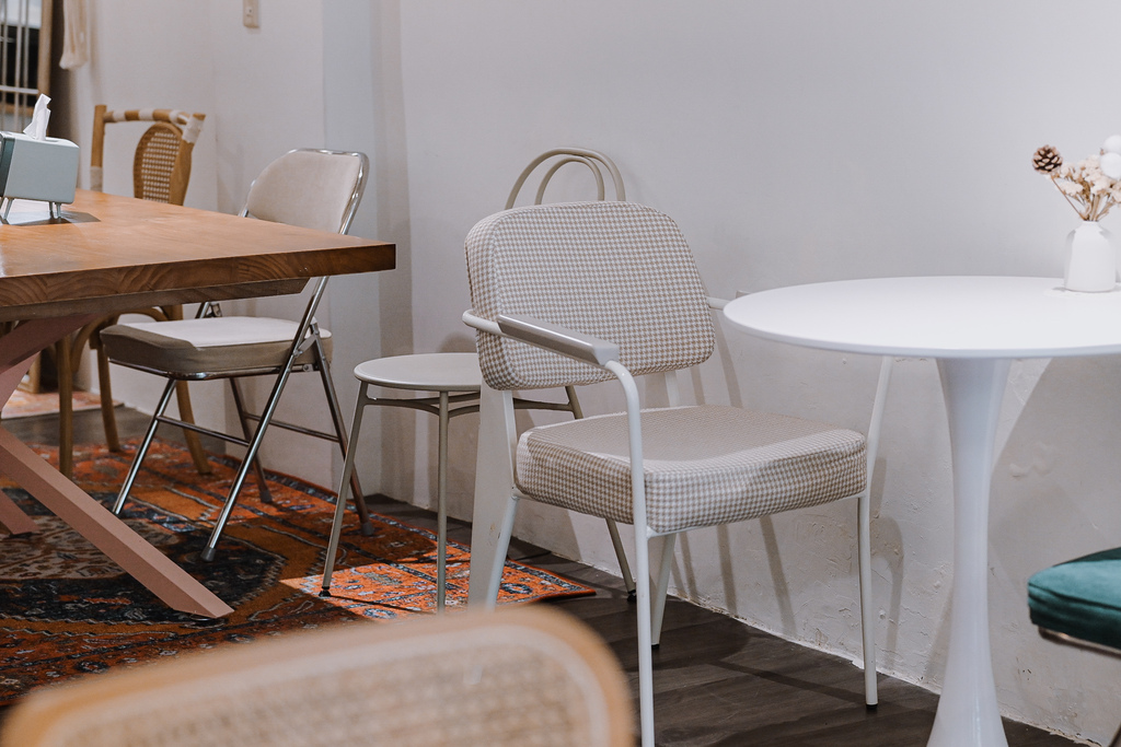 點餐後環繞四周環境,Moody Belly的擺設我好喜歡,是簡約質感韓風,用不同造型設計的桌椅、相框、掛鐘、地毯...呈現,其實好像不只是靠窗區美,不管座在那一處都能擁有不同的感受與絕佳視角,光線是由亮延伸至室內的暗色調,好溫馨的氛圍,