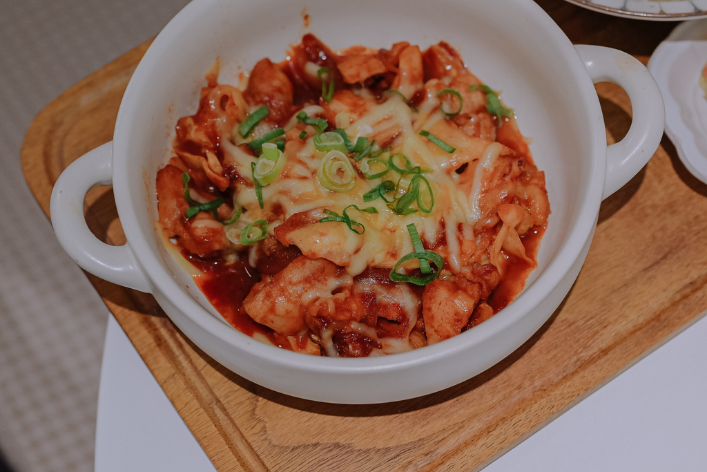 時隔一年許久未吃到正宗的韓國口味,在午後還沒進食的我們就來一道熱騰騰想念的味道。一送上來是套餐,春川起司辣炒雞、韓式玉子燒、飯都分開放。