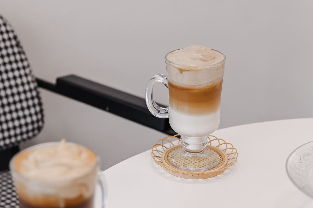 上層是黃豆粉奶霜,中間是咖啡下層是牛奶,非常有漸層感,咖啡均勻攪拌後咖啡香氣濃郁帶有黃豆粉香氣,不死甜,顯少有店家會販售,是杯很有特色的一款飲品。