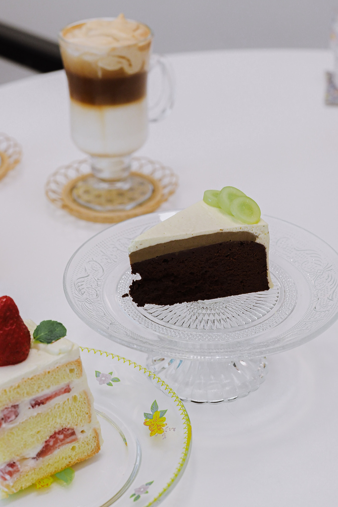 滿少見的口味,漸層色的巧克力蛋糕上面擺放了切片青葡萄,切下去可感受蛋糕體非常紮實有點硬度,上層是伯爵茶,茶香濃郁,下層是生巧克力蛋糕,生巧克力滑順充滿巧克力香氣,但吃到最後有點甜膩,但搭配咖啡或茶就很適合。