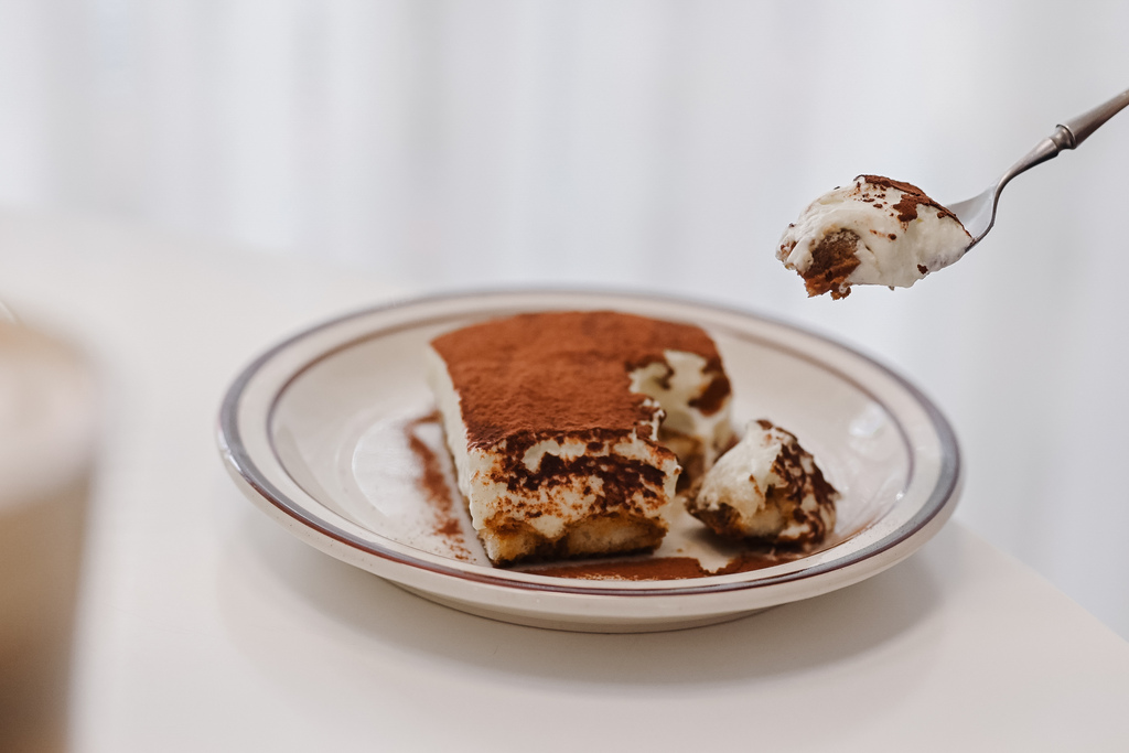 方方正正超經典義式風味甜點,切下去就可以感受到提拉米蘇的柔軟度,本體非常濕潤滑順入口即化,帶有淡淡酒氣與濃郁咖啡香,