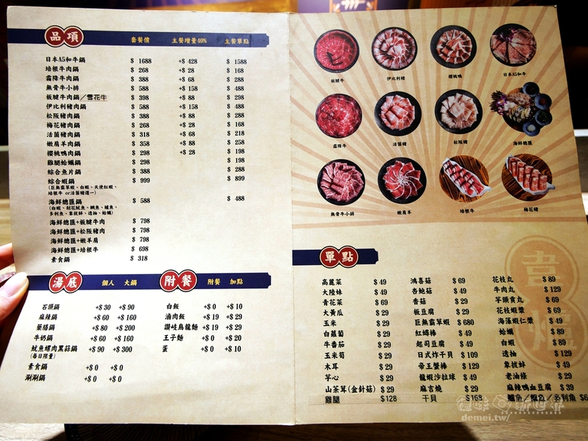 細看主餐價格由最經濟的日本培根牛($268元)至最高檔的日本A5和牛鍋($1688元),