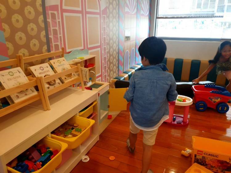 算是小而巧的親子遊戲室,雖然空間比較小,該有的玩具沒有少喔,扮家家酒、積木及親子童書,一旁設置迷你型的球池(當天因為疫情關係,球池內沒有擺放球)。遊戲室內設有洗手間,對於獨自帶著孩子的家長來說是非常方便。