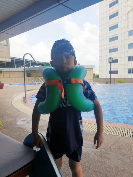 叡哥已經全副武裝準備下水大戰一番,由於妮姊在大班銜接國小期間,就學會游泳這項技能,舉凡蛙式、自由式及仰式都難不倒她,唯獨叡哥也許上輩子就是貓,一直無法克服入水閉氣,每回玩水都必須像上戰場一般!