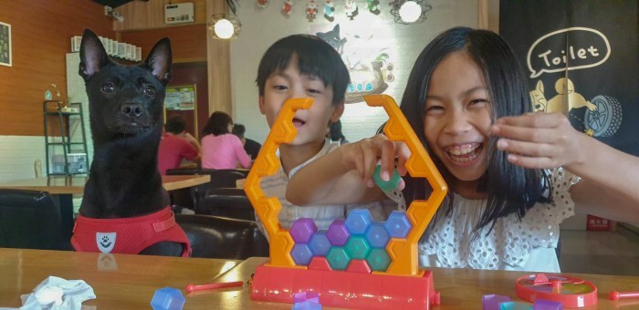 畢竟在戶外待久了,不論是毛孩或者鏟屎官都蠻費體力的,帶入室內來吹吹冷氣,補充一下水分。陪姊姊哥哥們一起玩玩桌遊,休息片刻再去奔跑。