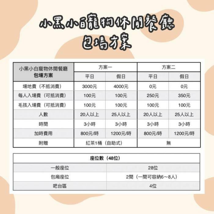 與孩子同樂外能不能結合親子與寵物友善的餐廳?想不到在都市區內能有一處餐廳,「小黑小白寵物休閒餐廳」,擁有大片的草原,讓狗狗能夠奔跑放電外,不時還有店貓店狗穿梭見客,另外還有提供桌遊,與同行的朋友一起玩樂。不僅如此,還有提供狗狗專屬的餐點,店內提供二間包廂式座位,只要提前預約就能夠享受獨立空間。溫馨提醒,夏日蚊蟲多,帶狗狗到草皮的同時也要注意蚊蟲叮咬。