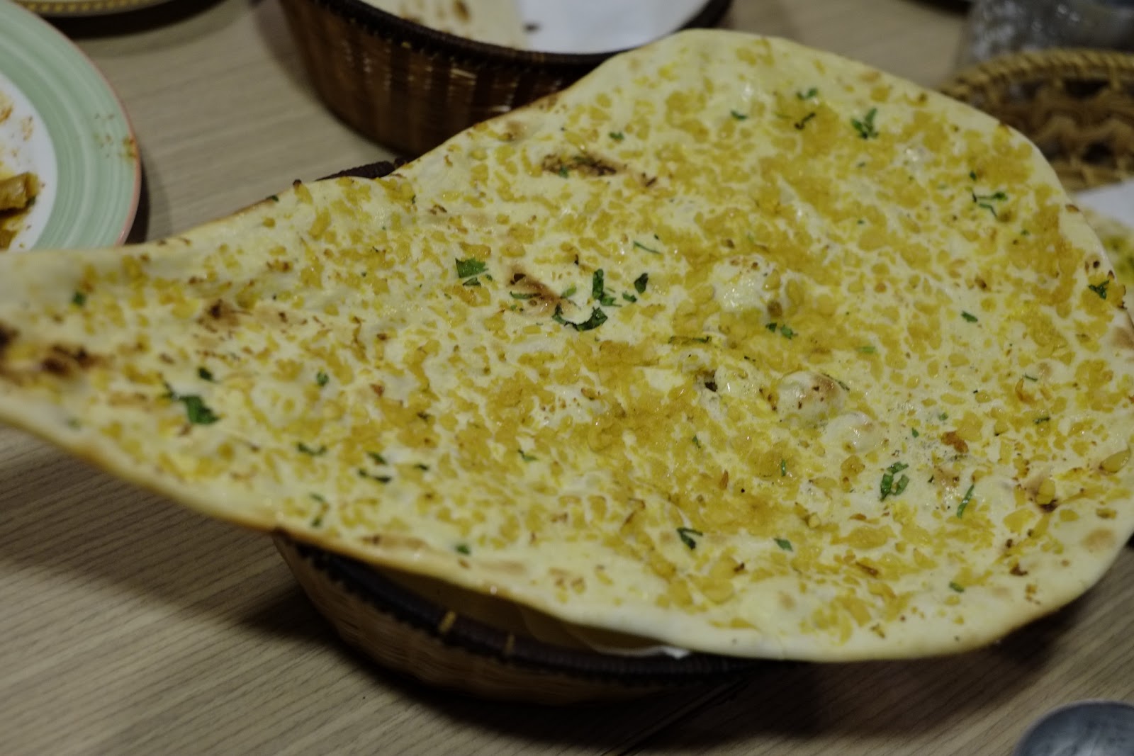 接下來是蒜香烤餅,遠遠端來就能聞到蒜頭的味道。跟前面兩道比,這道就很重口味,不過吃起比香蒜麵包可口,油膩感也比較不重。