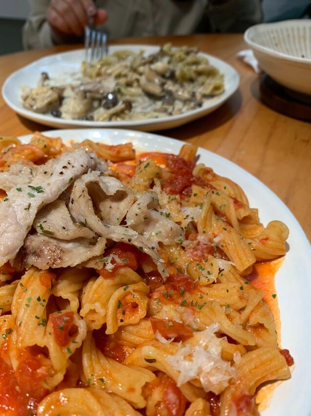 今天點了兩個義大利麵和兩個套餐:彈口蕃茄松阪豬麵、松露綜合野菇白醬麵,套餐選擇180元湯/沙拉/麵包/飲料四選三
