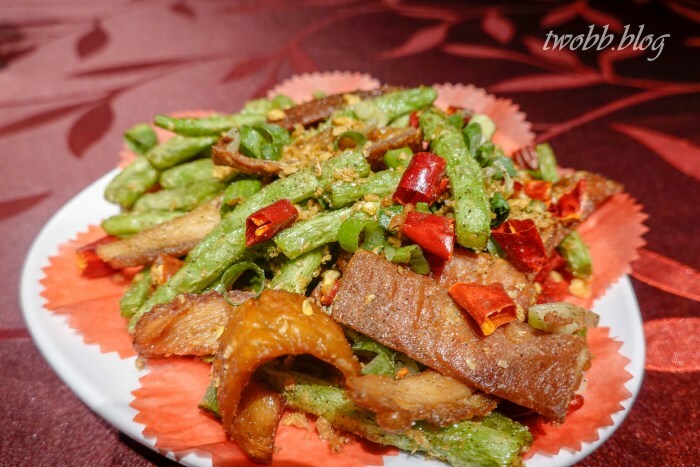 這道四季肥腸的胡椒鹽與龍珠一樣夠味,灑得相當均勻。辣椒則只是提味使用,增色卻不過辣,搭配肥腸一起吃很開胃。另外一定要搭配四季豆,讓四季豆的水份平衡肥腸的膩感,爽口又去膩。
